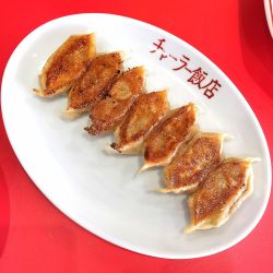 メインにJ系ラーメンを頼み、サイドは餃子400円。先に餃子が着皿して、間もなくラーメンがやって来ました。